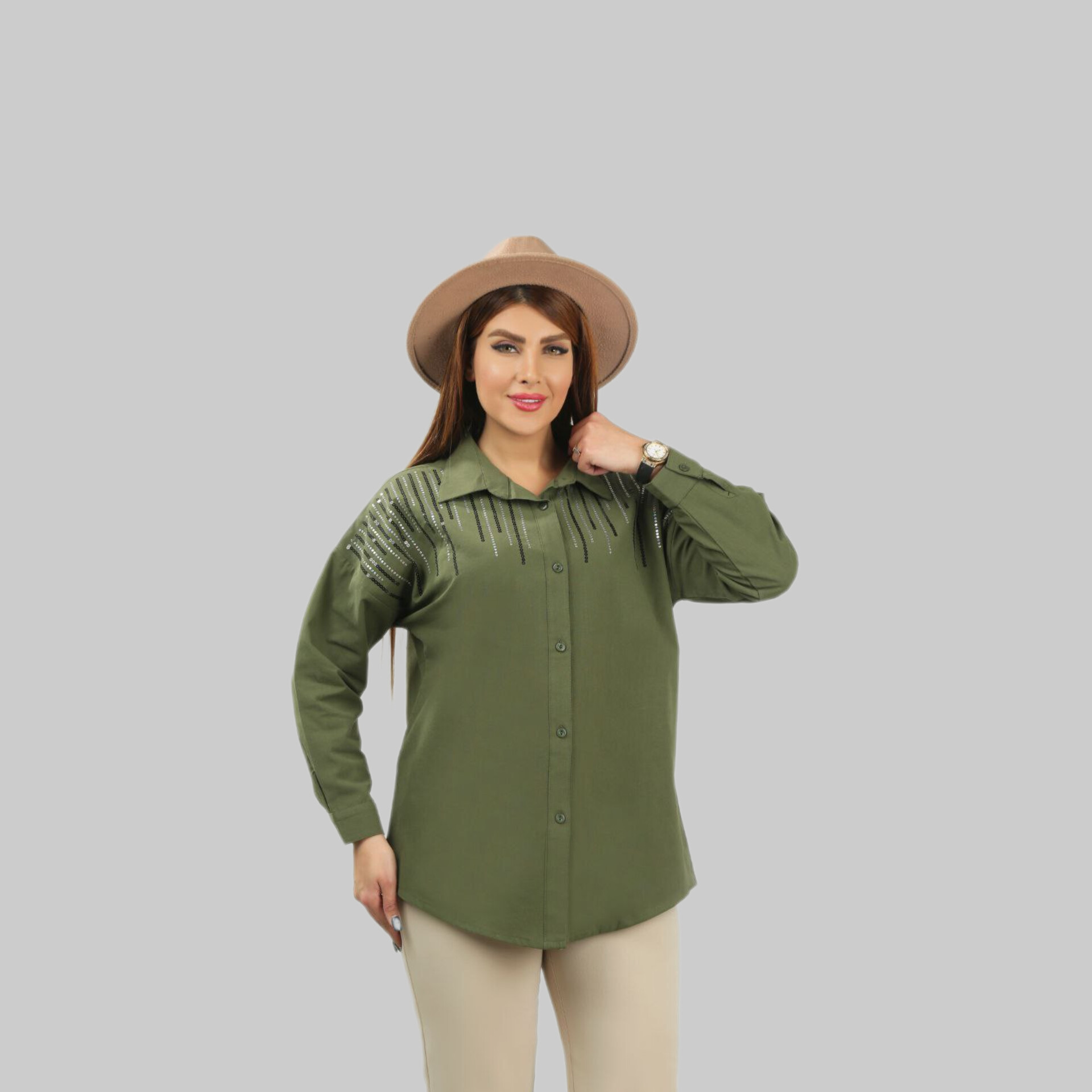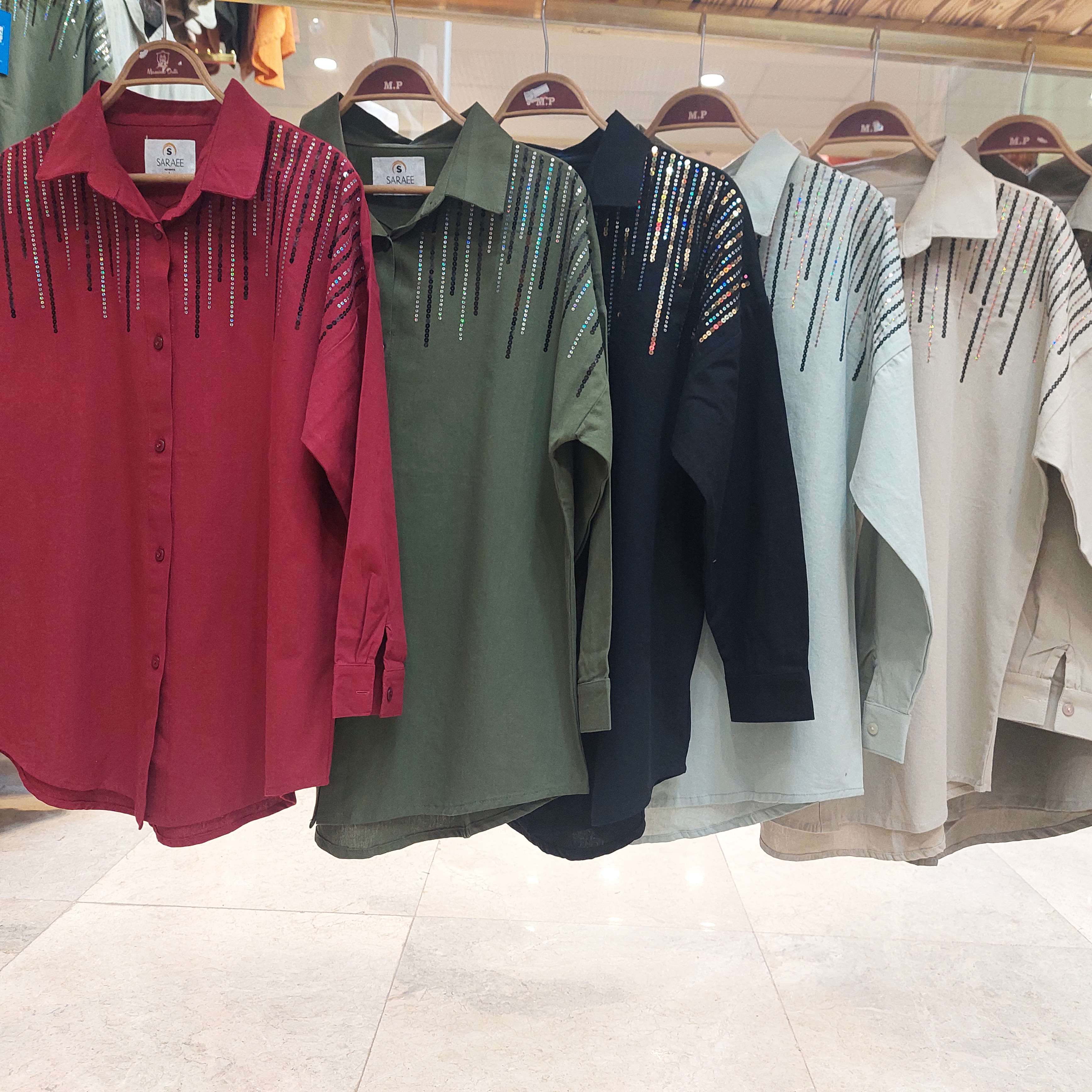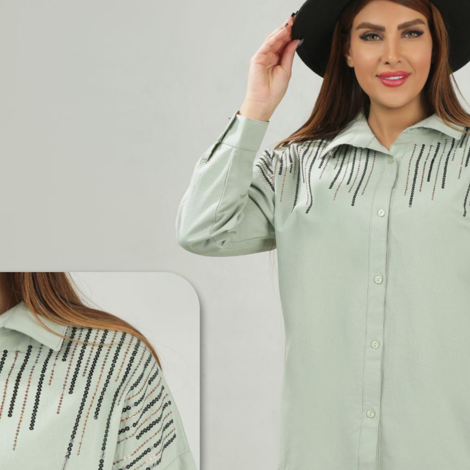 ⬅️ شومیز سرشانه پولک دوزی ✳️جنس: لنین ❇️رنگبندي : 6 ; مشکی،پسته ای،نسکافه ای، سبز ،کرم،زرشکی ❇️تعداد جین :12 ❇️سایز :L,XL