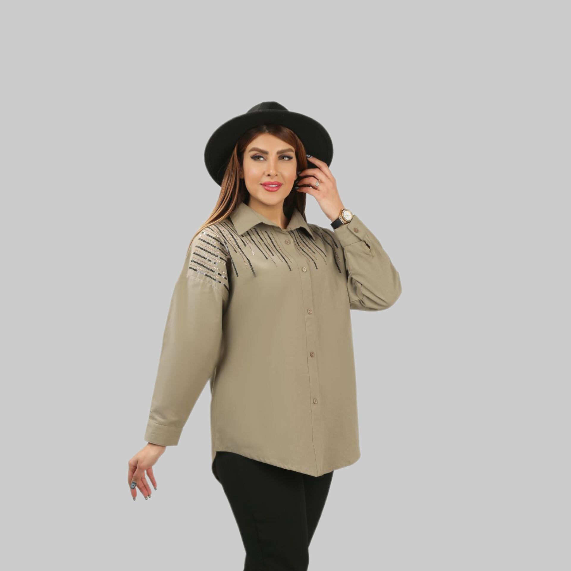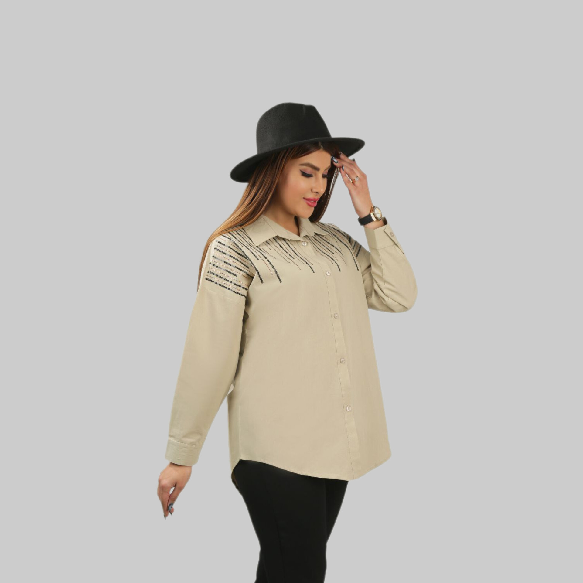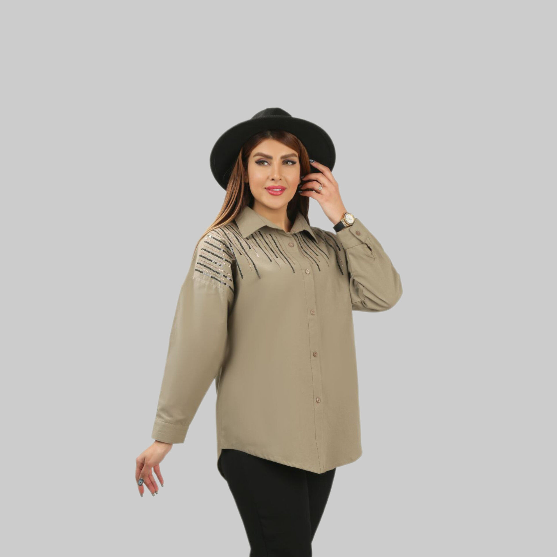 ⬅️ شومیز سرشانه پولک دوزی ✳️جنس: لنین ❇️رنگبندي : 6 ; مشکی،پسته ای،نسکافه ای، سبز ،کرم،زرشکی ❇️تعداد جین :12 ❇️سایز :L,XL